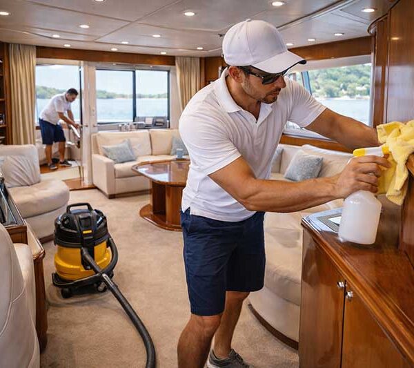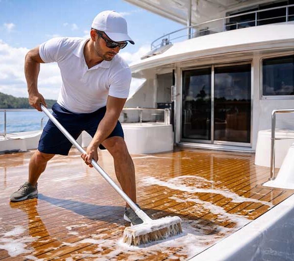 Trash removal, deck scrub (above rail), rinse, and chamois dry, vacuum, stainless steel polish, seat cleaning, cabin/console wipe-down, and glass/isinglass cleaning.